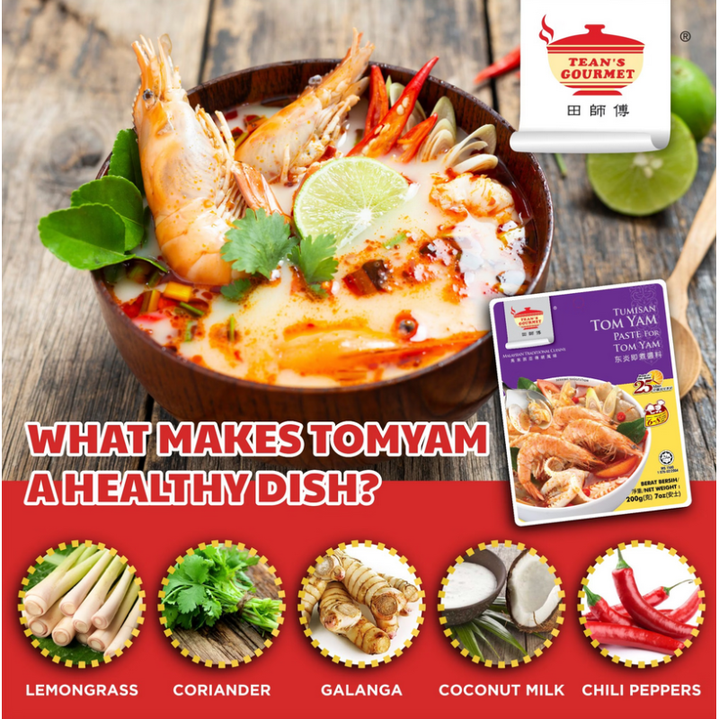 《田師傅東炎即煮醬料》的美味秘方加上辛香料,研配成擁有馬來西亞獨特風味的冬蔭醬料 ! 集酸、辣、鮮、香於一鍋的爽辣湯頭,完全可以媲美泰國道地的冬蔭功 !